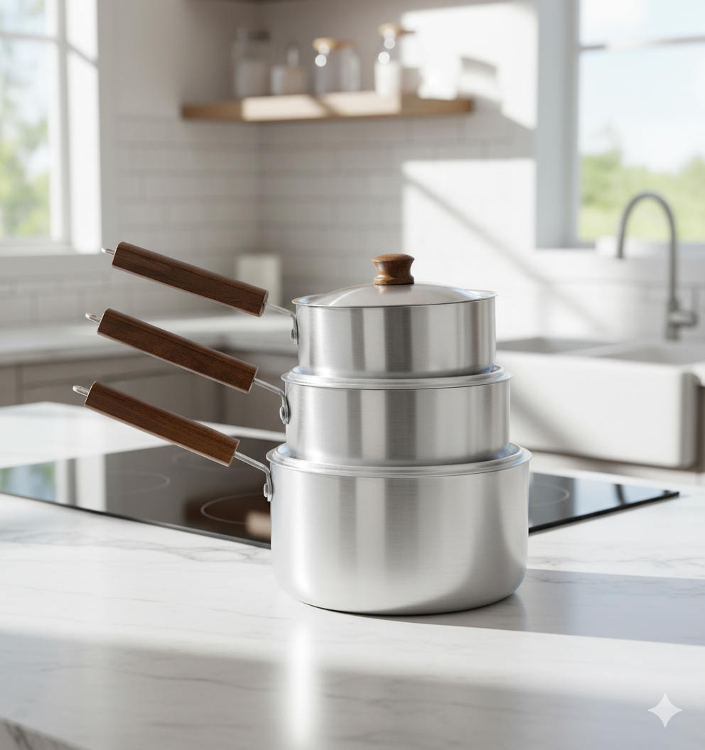 With rust-free durability, excellent heat conduction, and a stylish wooden finish, this 3-piece aluminium saucepan set is a perfect combination of function and design.